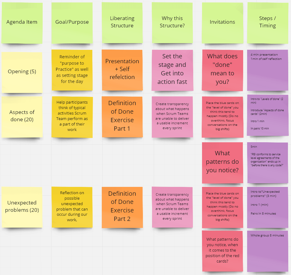 - Originally I planned the purpose-to-practice element “Principles” to be a part of this session, but the time schedule was to tight, to let the good discussions unfold, so I decided to skip the Principles for now.