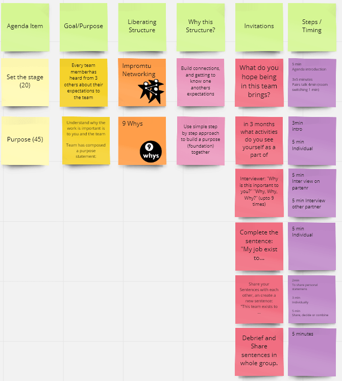 When a new team is formed we hope that it will be long lasting, and that it eventually will become high performing. Sometimes it happens, sometimes it doesn’t. What determines the success? Despite there are no guarantees of success, there are still things you can do to increase the likelihood of your team becoming high performing. In this blog post series, I would like to share some experiences of mine, from starting up new teams. Inspired by the Liberating Structure “Purpose-to-practice” I am helping the newly formed team to design five essential elements to make the team resilient and endurable. The 5 elements are Purpose, Principles, Participants, Structure and Practices. This post will cover my approach to help the team design Structure.